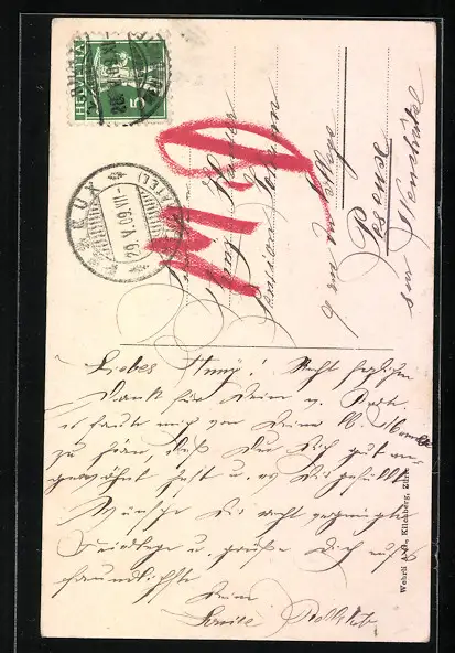 Personenbezogene Daten auf der Rückseite der Karte wurden durch blauen Textmarker unkenntlich gemacht. Die blauen Stellen sind auf die Vorderseite durchgeweicht und wirken sich negativ auf das Postkartenfoto aus