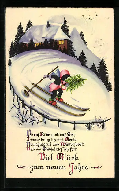 AK Kind fährt mit einem Tannenbaum Ski, Neujahrsgruss