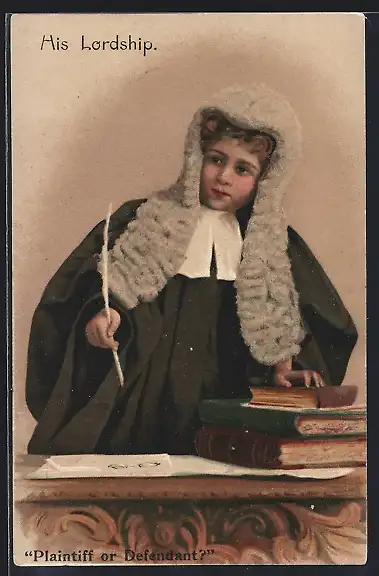 AK Kind in Richterrobe steht mit Schreibfeder und Büchern am Tisch