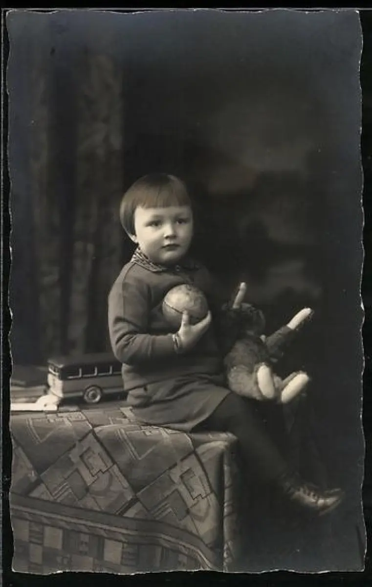 AK Kind mit Ball, Teddy und Spielzeugauto