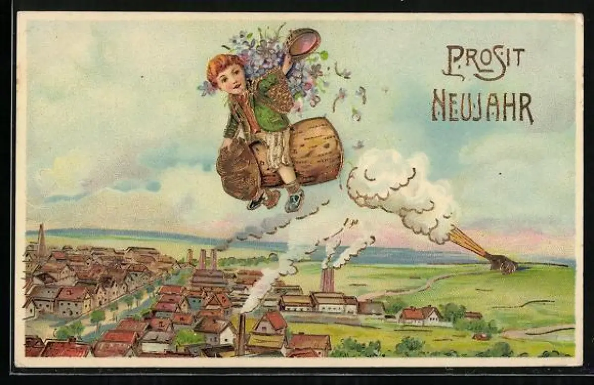 AK Kind mit Blumen fliegt auf einem Korken durch die Luft, Prosit Neujahr