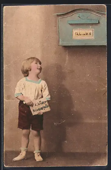 AK Kind mit Brief zu einem Briefkasten schauend