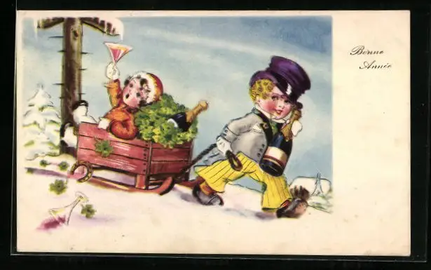 AK Kind mit Champagnerflasche zieht Mädchen im Schlitten