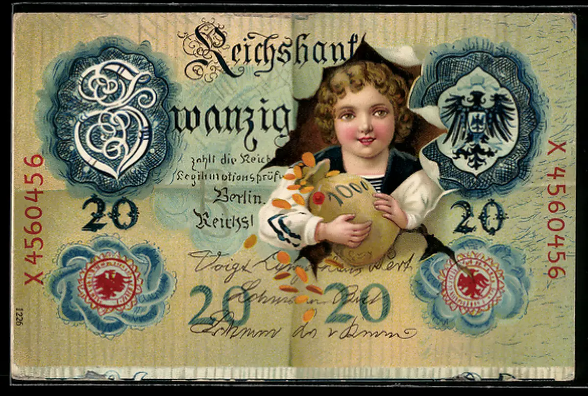 AK Kind mit Geldsack auf Banknote