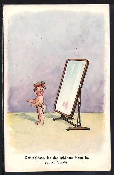 AK Kind mit Militärmütze und Dolch vor dem Speigel, Spruch
