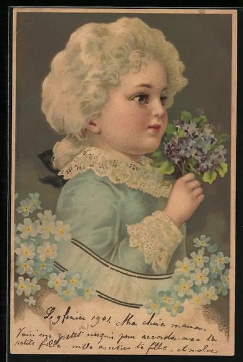 AK Kind mit barocker Perücke riecht am Vergissmeinnicht