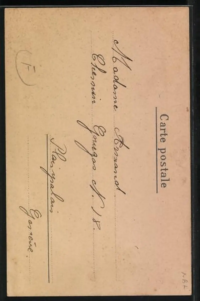Personenbezogene Daten auf der Rückseite der Karte wurden durch blauen Textmarker unkenntlich gemacht. Die blauen Stellen sind auf die Vorderseite durchgeweicht und wirken sich negativ auf das Postkartenfoto aus