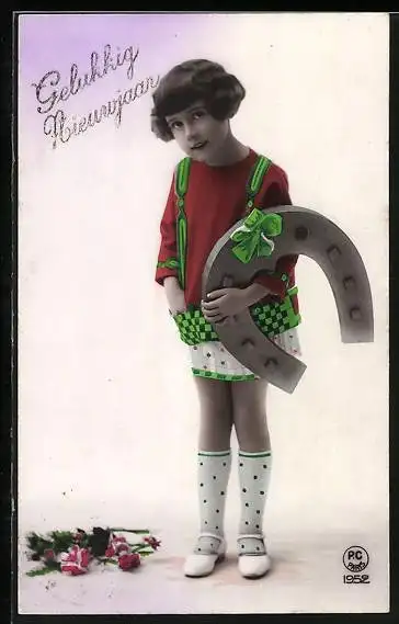 AK Kind mit grossem Hufeisen, Gelukkig Nieuwjaar