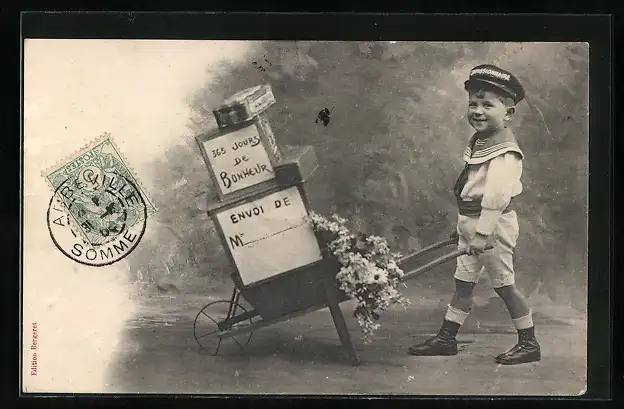 AK Kind schiebt eine Schubkarre, Jahreszahl 1906