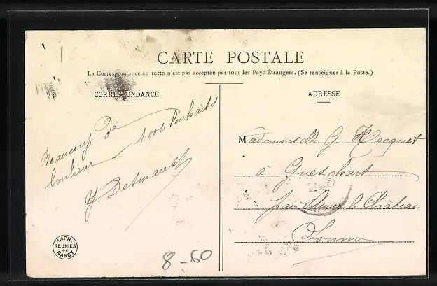 Personenbezogene Daten auf der Rückseite der Karte wurden durch blauen Textmarker unkenntlich gemacht. Die blauen Stellen sind auf die Vorderseite durchgeweicht und wirken sich negativ auf das Postkartenfoto aus