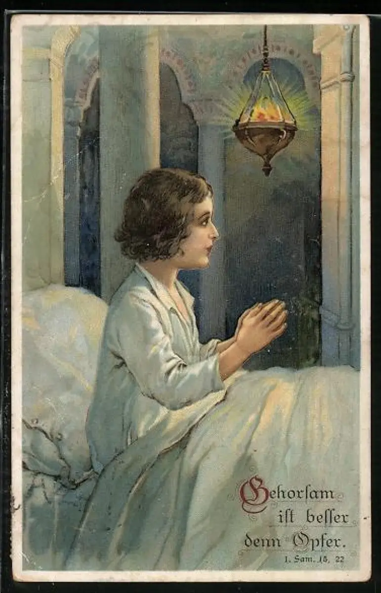 AK Kind sitzt im Bett und hat die Hände zum Gebet gefaltet, Gehorsam ist besser denn Opfer