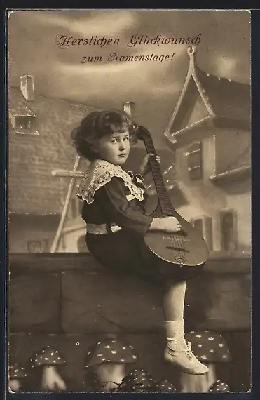 AK Kind sitzt mit Laute auf einer Mauer, Namenstag