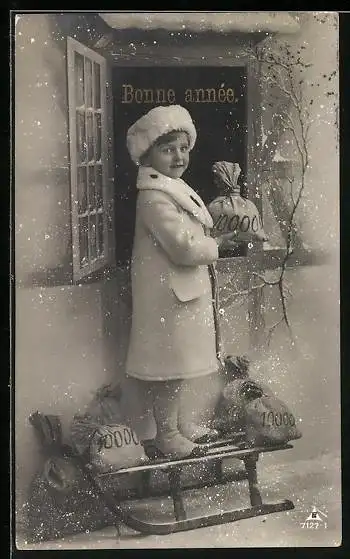 AK Kind steht auf einem Schlitten mit Geldsäcken, Bonne année