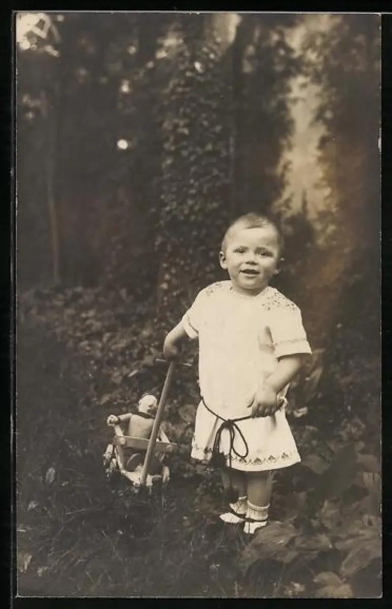 AK Kind zieht eine Puppe in einem Wagen hinter sich her