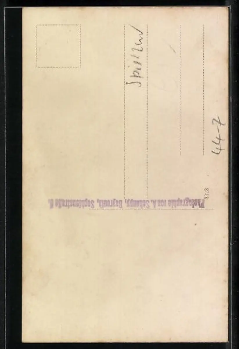 Personenbezogene Daten auf der Rückseite der Karte wurden durch blauen Textmarker unkenntlich gemacht. Die blauen Stellen sind auf die Vorderseite durchgeweicht und wirken sich negativ auf das Postkartenfoto aus