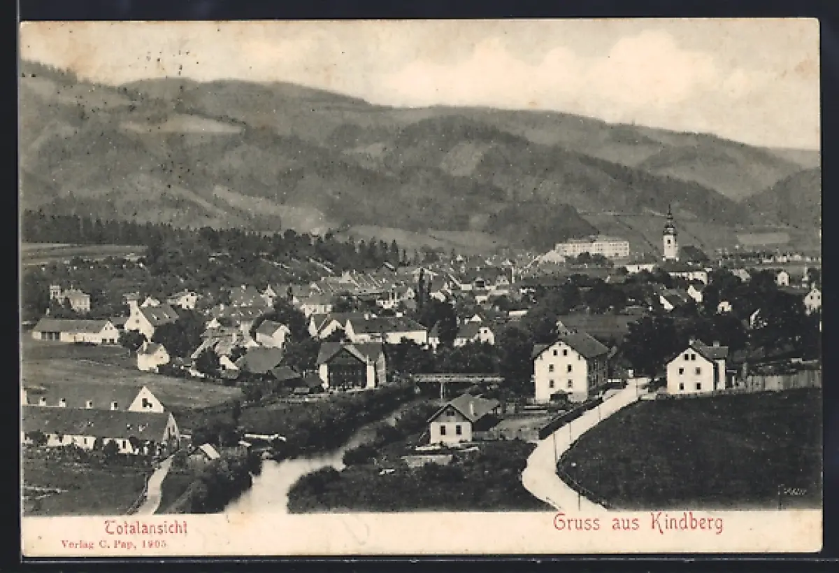 AK Kindberg, Totalansicht mit Bergpanorama