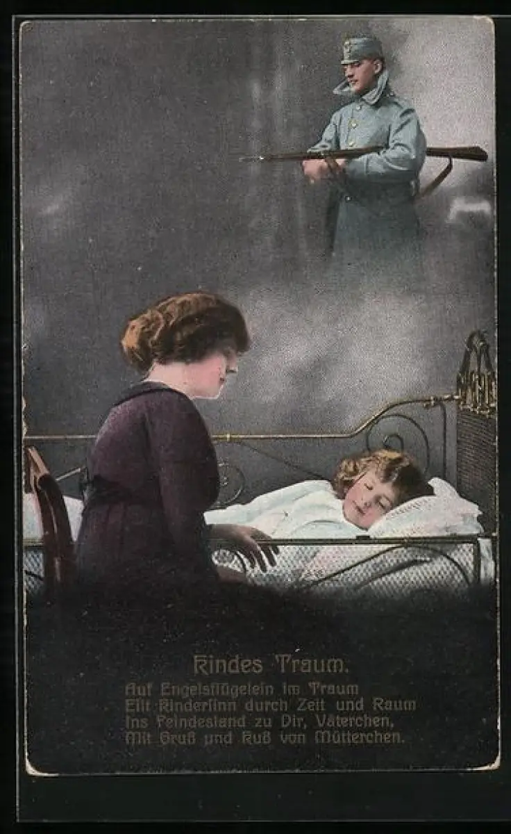 AK Kinder Kriegspropaganda, Kindes Traum, Mädchen träumt vom Vater, Soldat in Uniform mit Pickelhaube und Gewehr