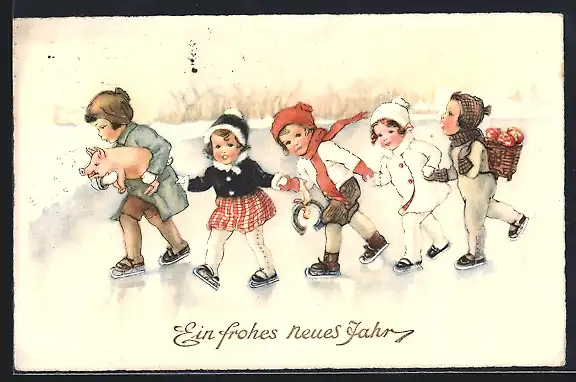 AK Kinder beim Schlittschuhlaufen in Reihe