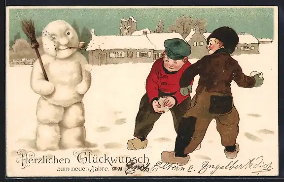 AK Kinder bewerfen einen Schneemann mit Schneebällen, Neujahrsgruss