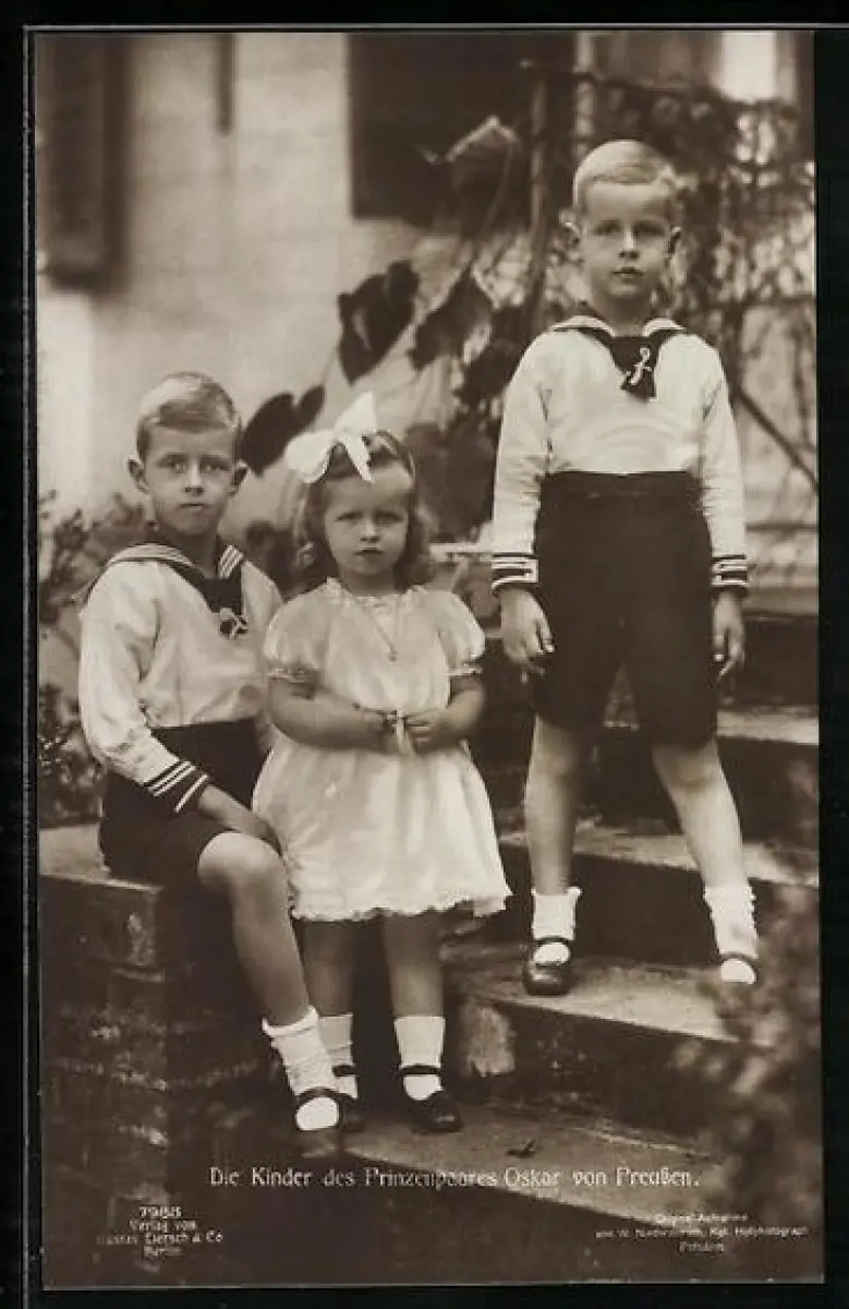 AK Kinder des Prinzenpaares Oskar von Preussen, in Matrosenuniform und Kleid auf dem Treppenaufgang