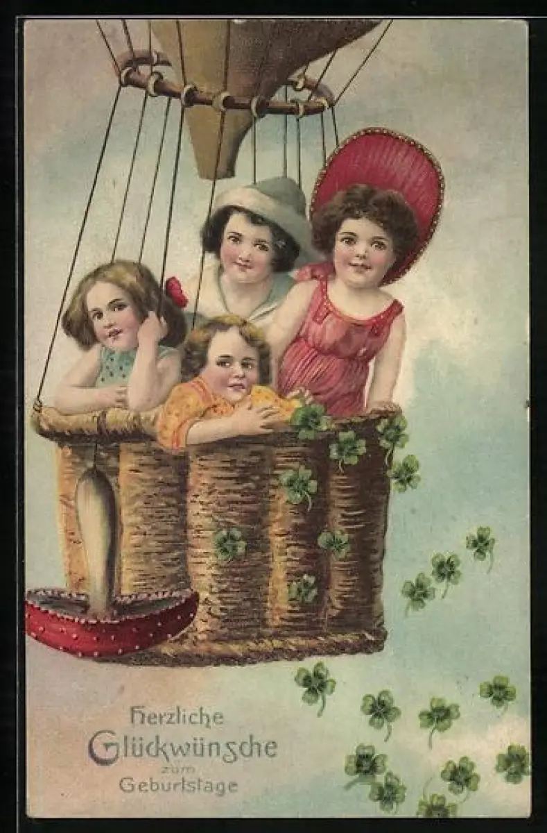 AK Kinder im Korb eines Heissluftballons, Herzlichen Glückwunsch zum Geburtstage