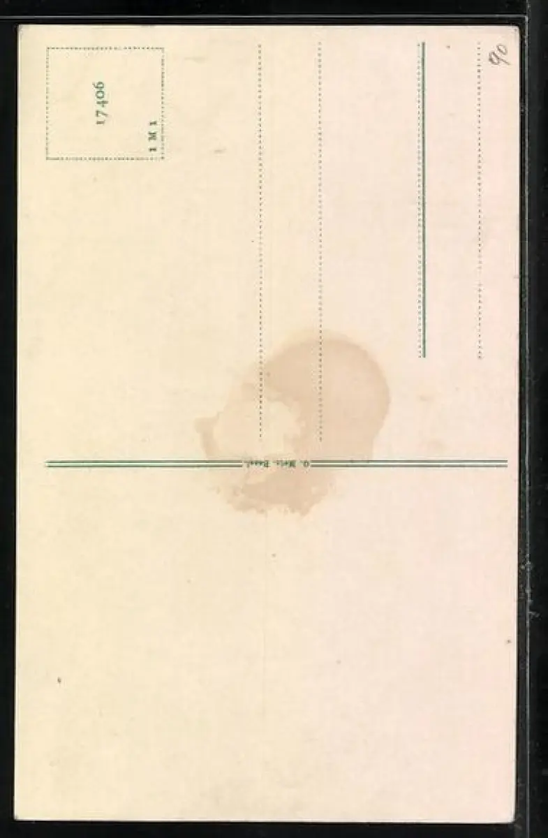 Personenbezogene Daten auf der Rückseite der Karte wurden durch blauen Textmarker unkenntlich gemacht. Die blauen Stellen sind auf die Vorderseite durchgeweicht und wirken sich negativ auf das Postkartenfoto aus