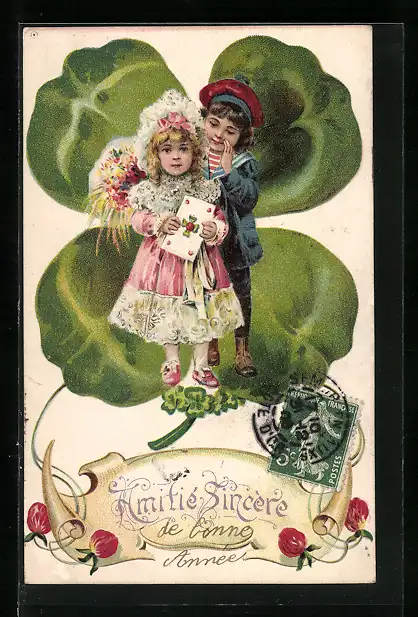 AK Kinder mit Brief vor riesigem Kleeblatt