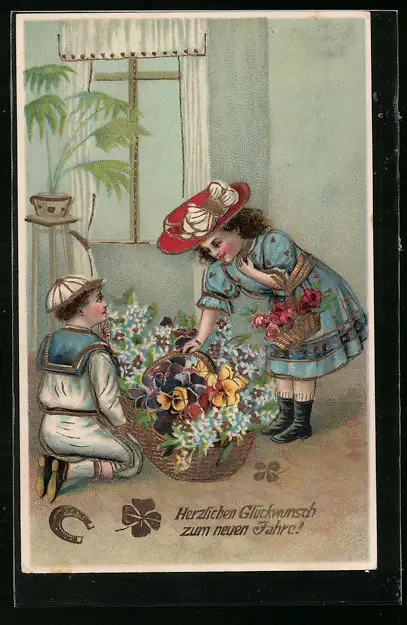 AK Kinder mit Korb voller Blumen zu Neujahr