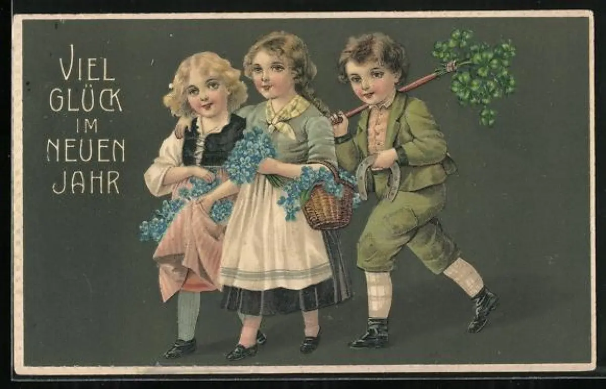 AK Kinder sammeln Vergissmeinnicht und Hufeisen zum Neuen Jahr