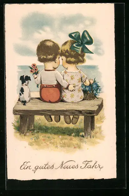 AK Kinder sitzen auf der Bank zu Neujahr neben Hund