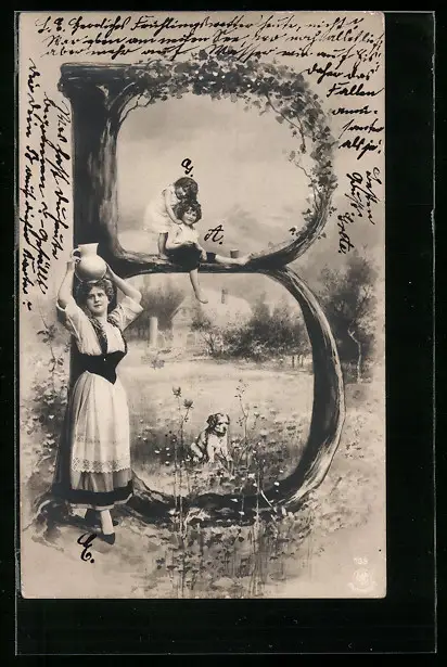 AK Kinder sitzen im Buchstaben B, Frau in Tracht balanciert einen Krug auf dem Kopf