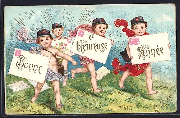 AK Kinder tragen Briefe mit den Aufschriften Bonne Année et Heureuse über eine Wiese