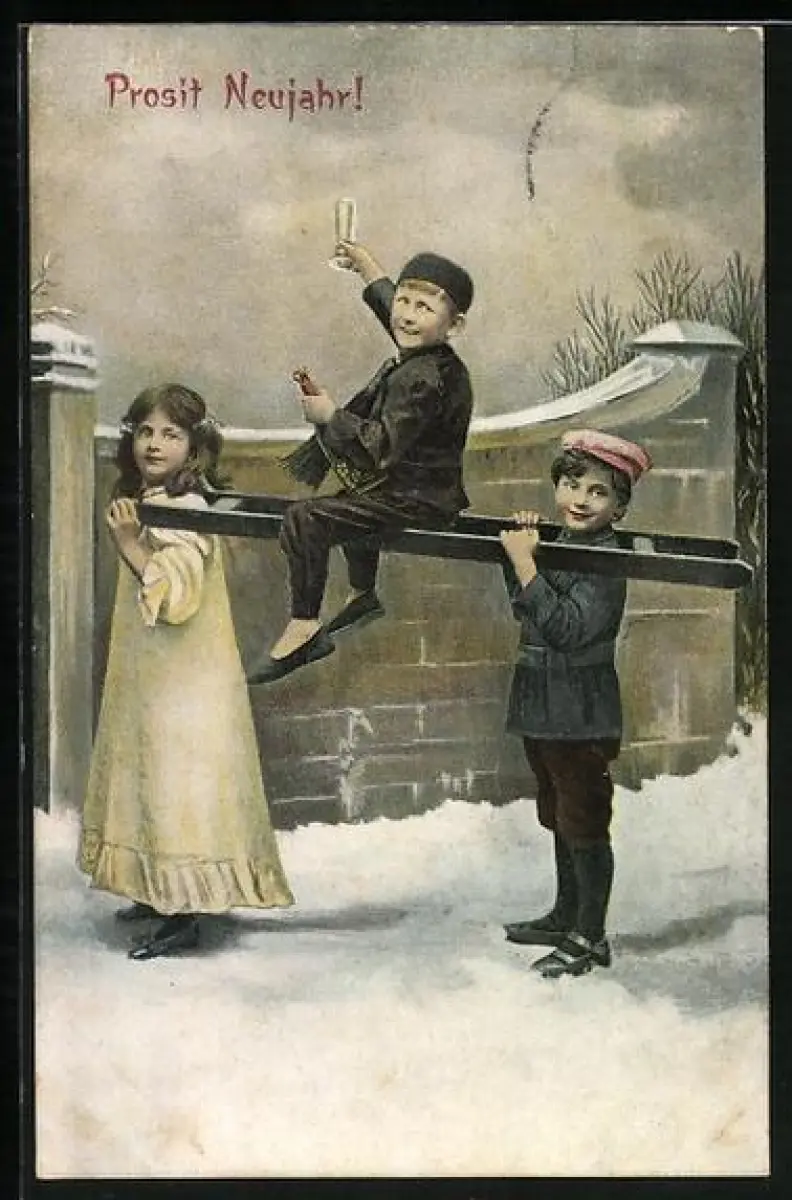 AK Kinder tragen auf der Leiter einen Schornsteinfeger, Neujahr