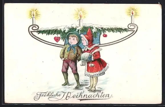 AK Kinder unter einem Tannenzweig mit Kerzen, Fröhliche Weihnachten
