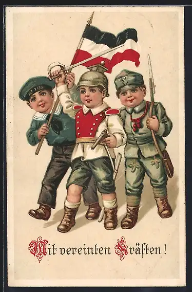 AK Kinder verkleidet als Soldaten des Zweibundes mit Fahne, Säbel u. Gewehr
