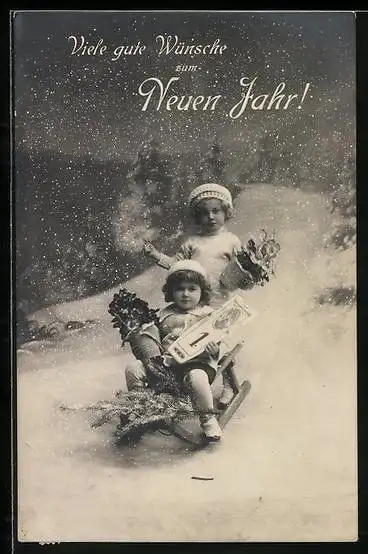 AK Kinderpaar mit Kalenderblatt auf Schlitten, Neujahrsgruss