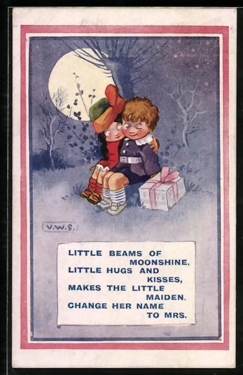 AK Kinderpaar mit Päckchen bei Mondschein