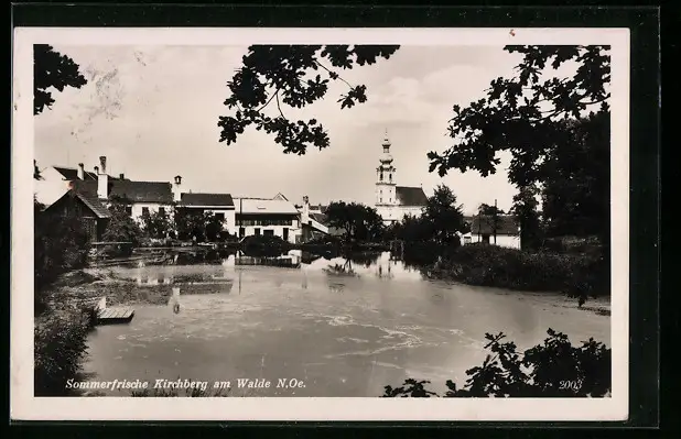AK Kirchberg am Walde /N.-Oe., Uferpartie mit Kirche