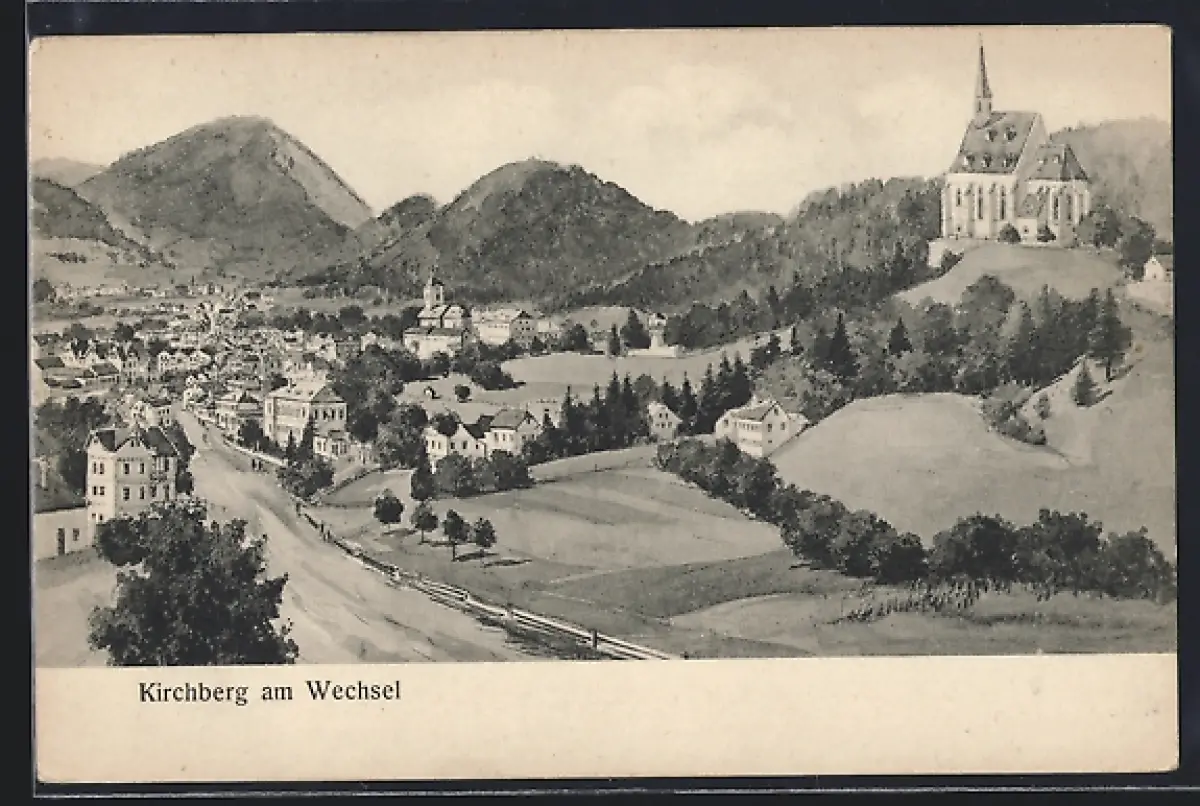 AK Kirchberg am Wechsel, Ortsansicht mit Kirche und umliegenden Bergen