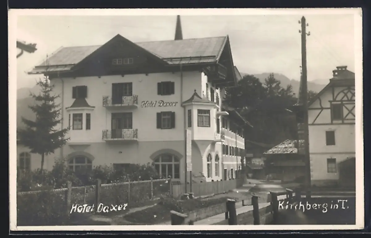 AK Kirchberg in T., Hotel-Pension Daxer mit Strasse u. Bergpanorama