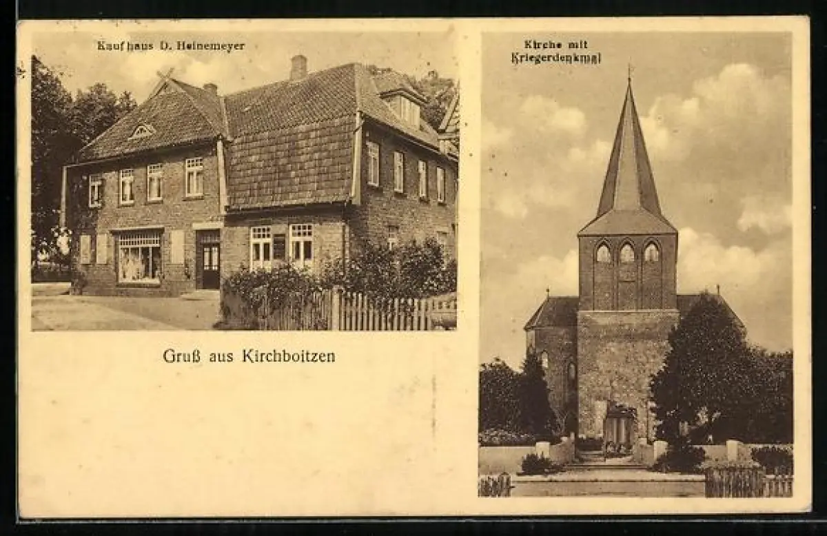 AK Kirchboitzen, Kaufhaus D. Heinemeyer, Kirche mit Kriegerdenkmal