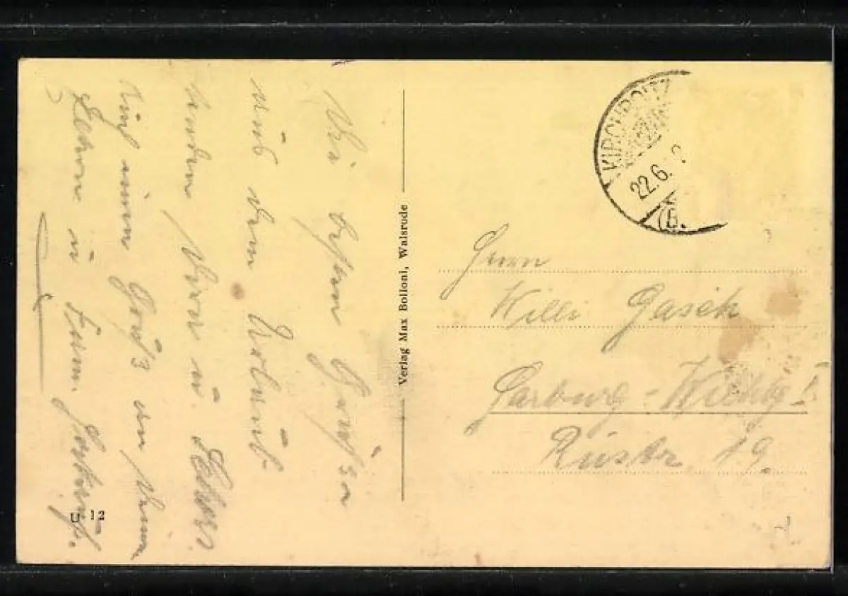 Personenbezogene Daten auf der Rückseite der Karte wurden durch blauen Textmarker unkenntlich gemacht. Die blauen Stellen sind auf die Vorderseite durchgeweicht und wirken sich negativ auf das Postkartenfoto aus