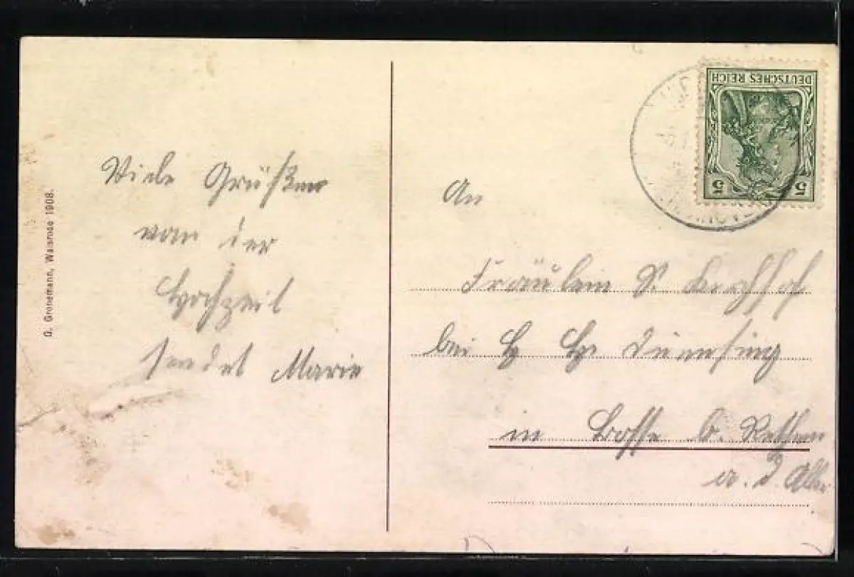 Personenbezogene Daten auf der Rückseite der Karte wurden durch blauen Textmarker unkenntlich gemacht. Die blauen Stellen sind auf die Vorderseite durchgeweicht und wirken sich negativ auf das Postkartenfoto aus