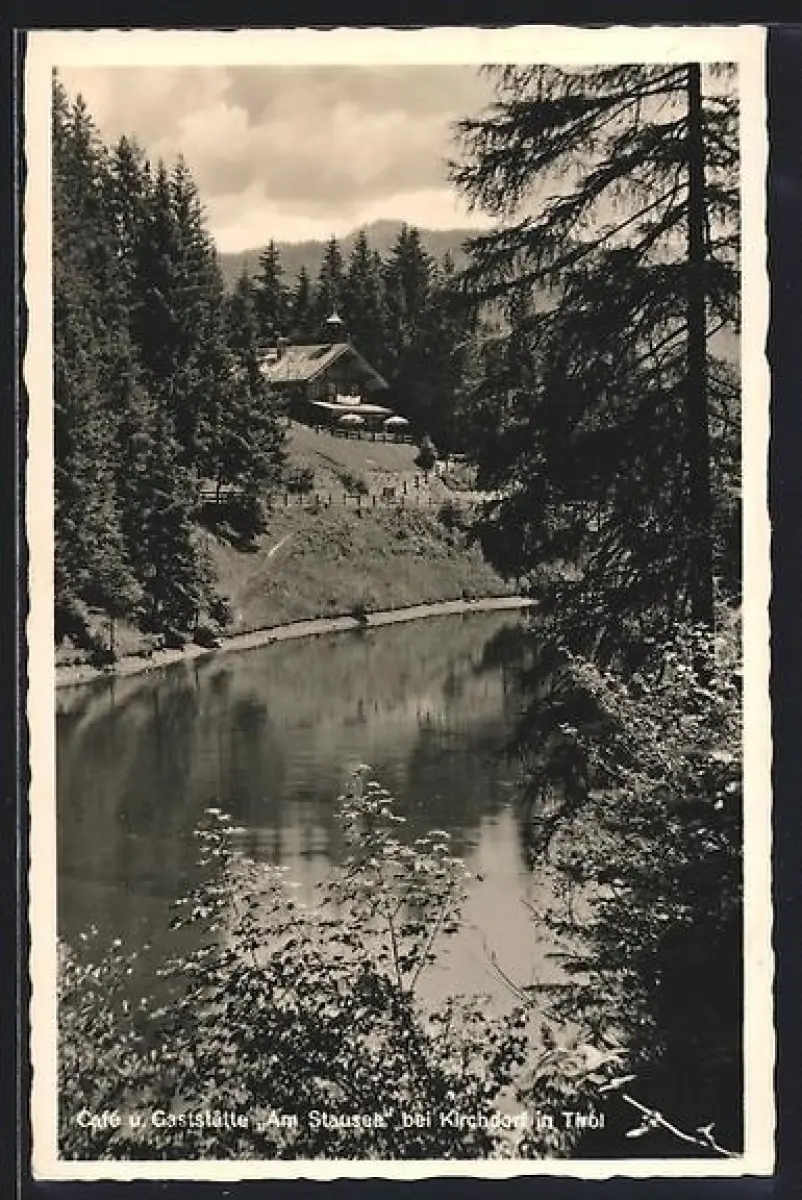 AK Kirchdorf in Tirol, Café-Gaststätte Am Stausee vom Wasser aus
