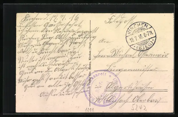 Personenbezogene Daten auf der Rückseite der Karte wurden durch blauen Textmarker unkenntlich gemacht. Die blauen Stellen sind auf die Vorderseite durchgeweicht und wirken sich negativ auf das Postkartenfoto aus