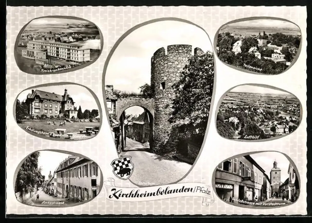 AK Kirchheimbolanden /Pfalz, Schlossstrasse mit Vorstadtturm, Amtsstrasse, Erholungsheim, Kreiskrankenhaus
