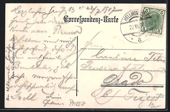 Personenbezogene Daten auf der Rückseite der Karte wurden durch blauen Textmarker unkenntlich gemacht. Die blauen Stellen sind auf die Vorderseite durchgeweicht und wirken sich negativ auf das Postkartenfoto aus