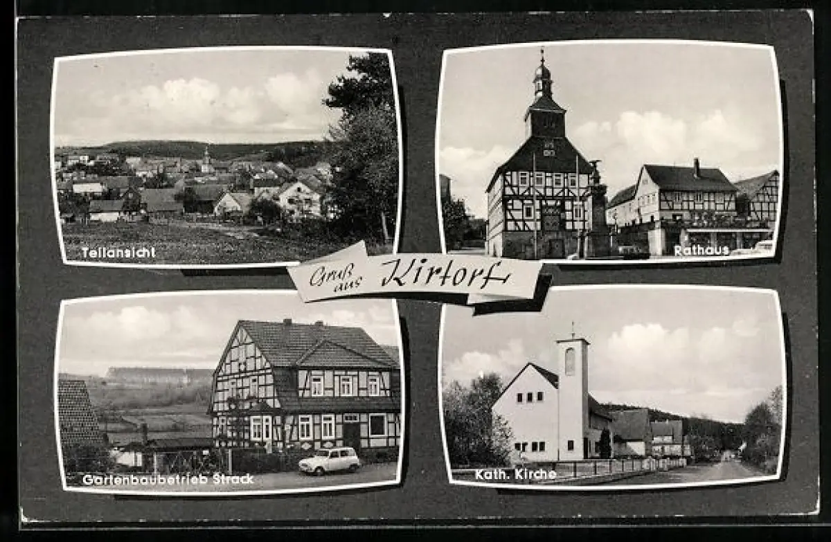 AK Kirtorf, Teilansicht, Rathaus, Gartenbaubetrieb Strack, Kath. Kirche