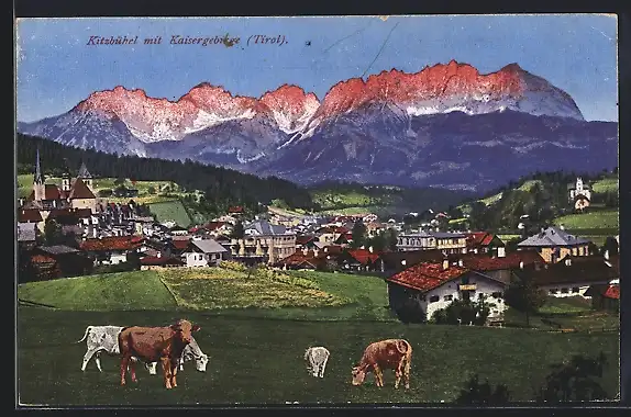 AK Kitzbühel, Kühe weiden vor der Ortschaft, Alpenglühen des Kaisergebirges