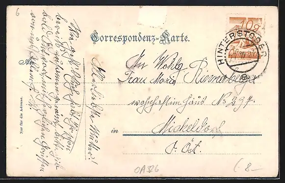 Personenbezogene Daten auf der Rückseite der Karte wurden durch blauen Textmarker unkenntlich gemacht. Die blauen Stellen sind auf die Vorderseite durchgeweicht und wirken sich negativ auf das Postkartenfoto aus